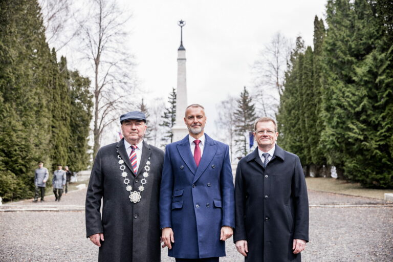 Zľava: Primátor Liptovského Mikuláša Ján Blcháč, predseda Národnej rady (NR) SR Richard Raši a podpredseda vlády SR pre plán obnovy a znalostnú ekonomiku Peter Kmec počas pietnej spomienky na Vojenskom pamätníku a cintoríne Háj Nicovô pri príležitosti 80. výročia oslobodenia mesta Liptovský Mikuláš. Liptovský Mikuláš, 5. apríl 2025. Foto: SITA/Kancelária Národnej rady SR