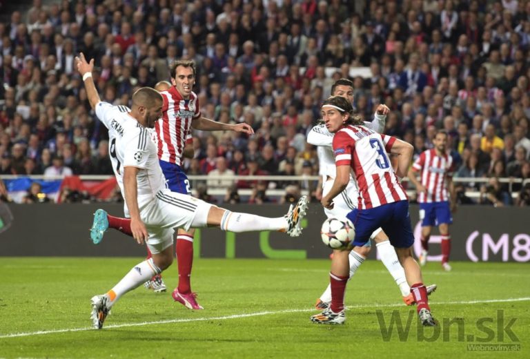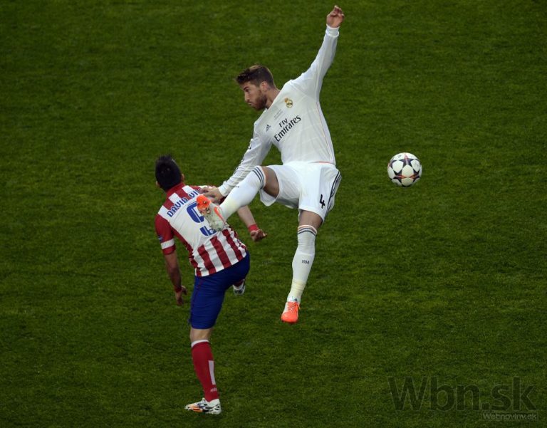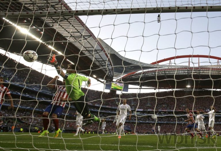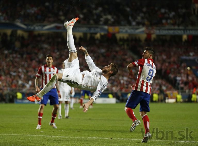 Sergio Ramos z Realu Madrid hlavičkuje loptu do siete Atlética a vyrovnáva na 1:1 počas finálového zápasu Ligy majstrov. Foto: SITA/AP