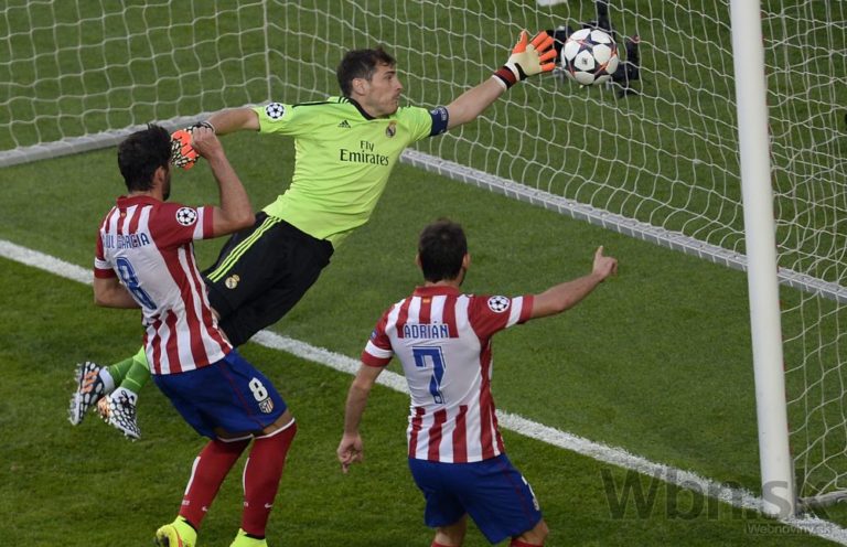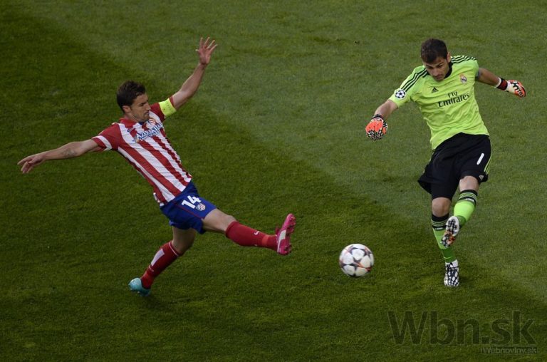 Zľava: Gabi z Atlética Madrid a brankár Realu Madrid Iker Casillas počas finálového zápasu Ligy majstrov. Foto: SITA/AP