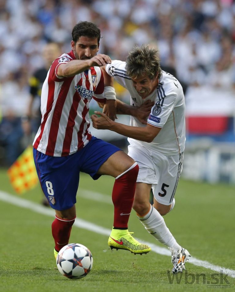 Fabio Coentrao z Realu Madrid v súboji o loptu s Raulom Garciom z Atlética počas finálového zápasu Ligy majstrov. Foto: SITA/AP