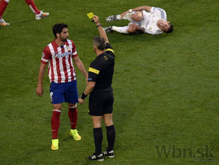 Hlavný rozhodca Björn Kuipers udeľuje Raulovi Garciovi z Atlética žltú kartu počas finálového zápasu Ligy majtrov. Foto: SITA/AP