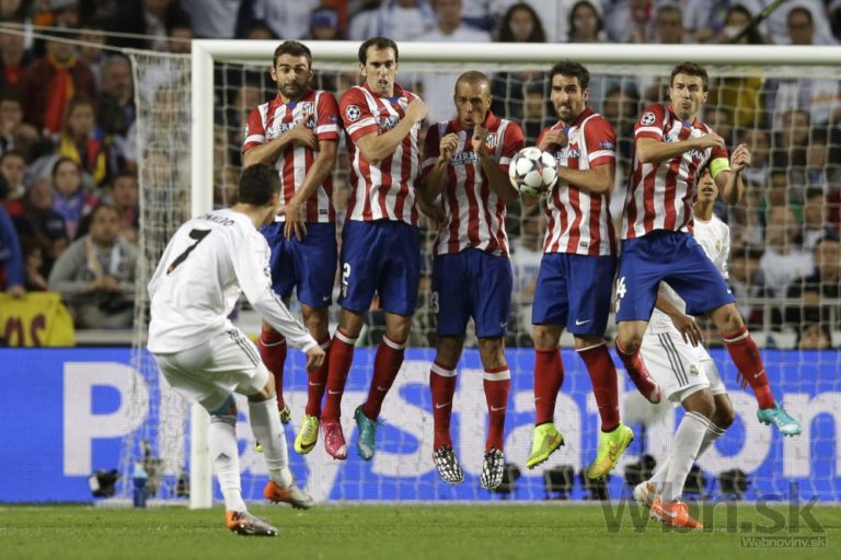 Priamy kop Cristiana Ronalda z Realu Madrid na bránku Atlética počas finálového zápasu Ligy majstrov. Foto: SITA/AP