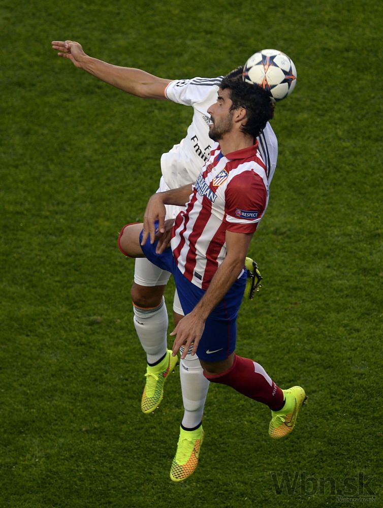 Diego Godin z Atlética hlavičkuje loptu do siete Realu Madrid počas finálového zápasu Ligy majstrov.