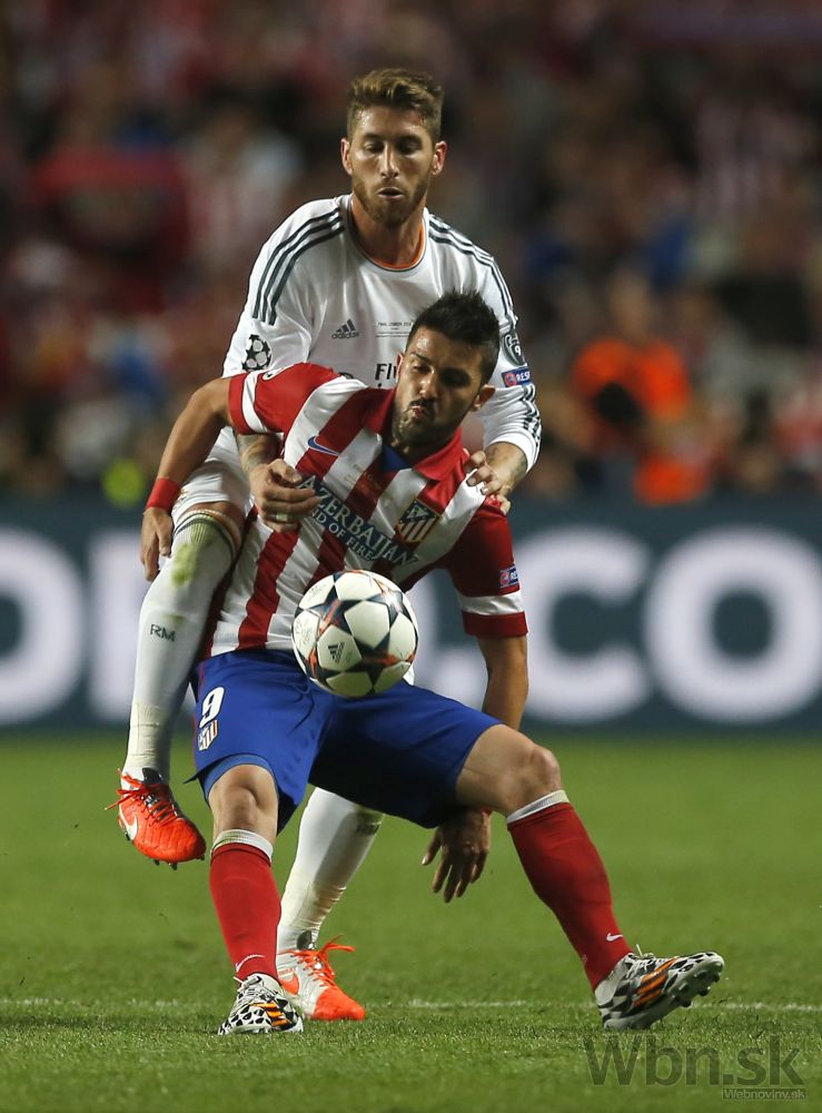 Útočník Atlética Madrid David Villa v súboji so Sergiom Ramosom počas finálového zápasu Ligy majstrov. Foto: SITA/AP