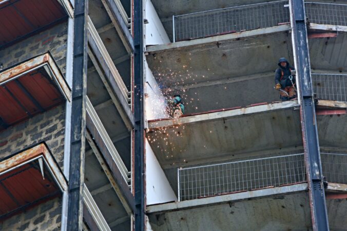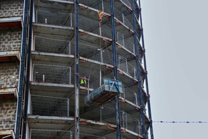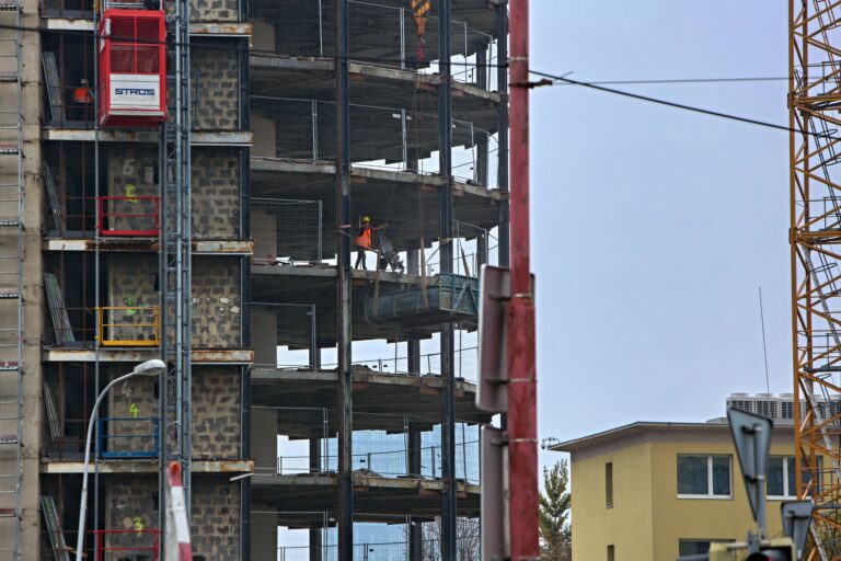 Pracovníci stavby počas rekonštrukcie bývalého Vojenského internátu Hviezda známeho ako Kukurica v Bratislave. Bratislava. 26. októbra 2024. Foto: SITA/Tomáš Susko