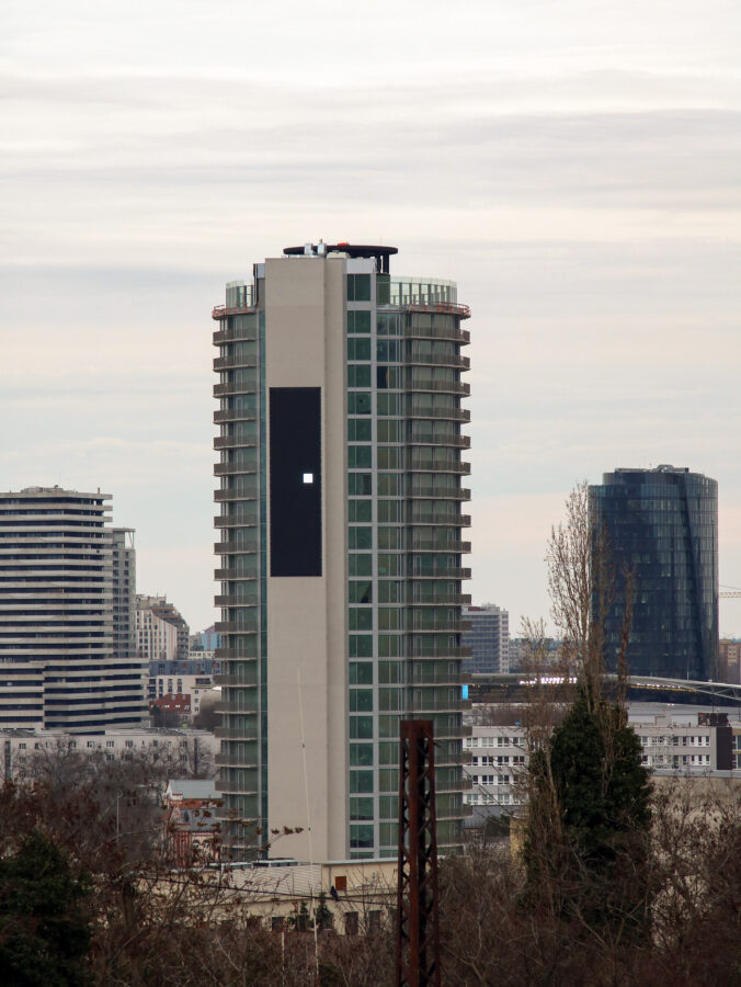 Zrekonštruovaná vojenská ubytovňa Hviezda, známa ako Kukurica (vpravo v popredí), s obrovskou LED obrazovkou na fasáde v Bratislave. Bratislava, 16. február 2026. Foto: SITA/Andrea Mezeiová
