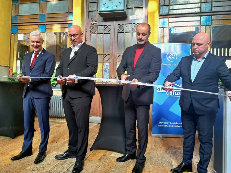 Zľava:. Primátor mesta Kežmarok Ján Ferenčák, minister dopravy SR Jozef Ráž, generálny riaditeľ Železníc Slovenskej republiky Alexander Sako a Marián Varga zo spoločnosti Stavoconzult pri prestrihávaní pásky pred začatím prác na obnove budovy železničnej stanice v Kežmarku, národnej kultúrnej pamiatky financovanej Železnicami Slovenskej republiky. Kežmarok, 7. október 2024. Foto: SITA/Mária Frisová