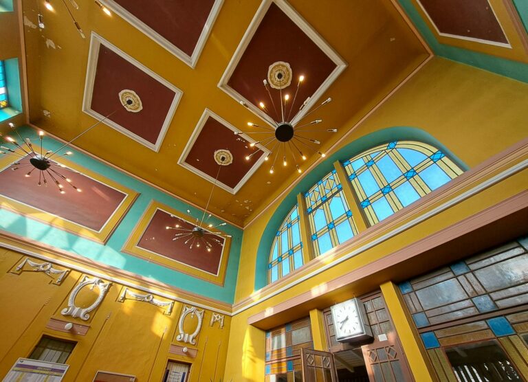 Detail výzdoby interiéru historickej budovy železničnej stanice v Kežmarku, národnej kultúrnej pamiatky, spolu s vitrážou, pred začiatkom rekonštrukcie financovanej Železnicami Slovenskej republiky. Kežmarok, 7. október 2024. Foto: archívne, SITA/Mária Frisová