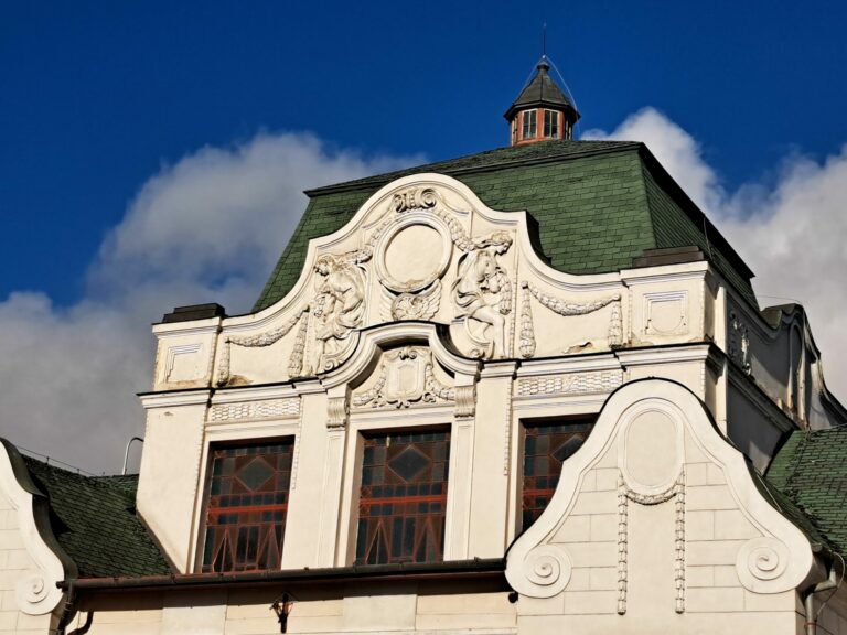 Detail štukovej výzdoby na fasáde historickej budovy železničnej stanice v Kežmarku, národnej kultúrnej pamiatky, pred začiatkom rekonštrukcie financovanej Železnicami Slovenskej republiky. Kežmarok, 7. október 2024. Foto: SITA/Mária Frisová