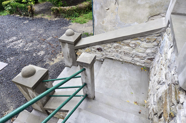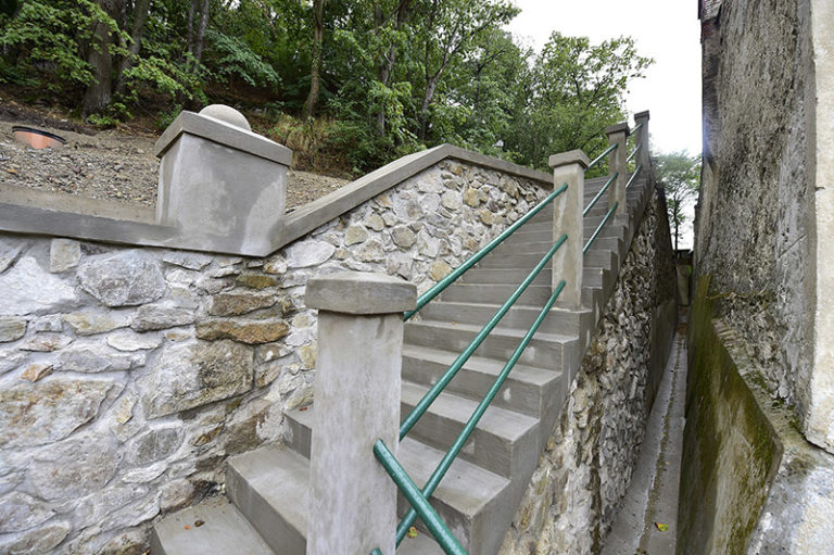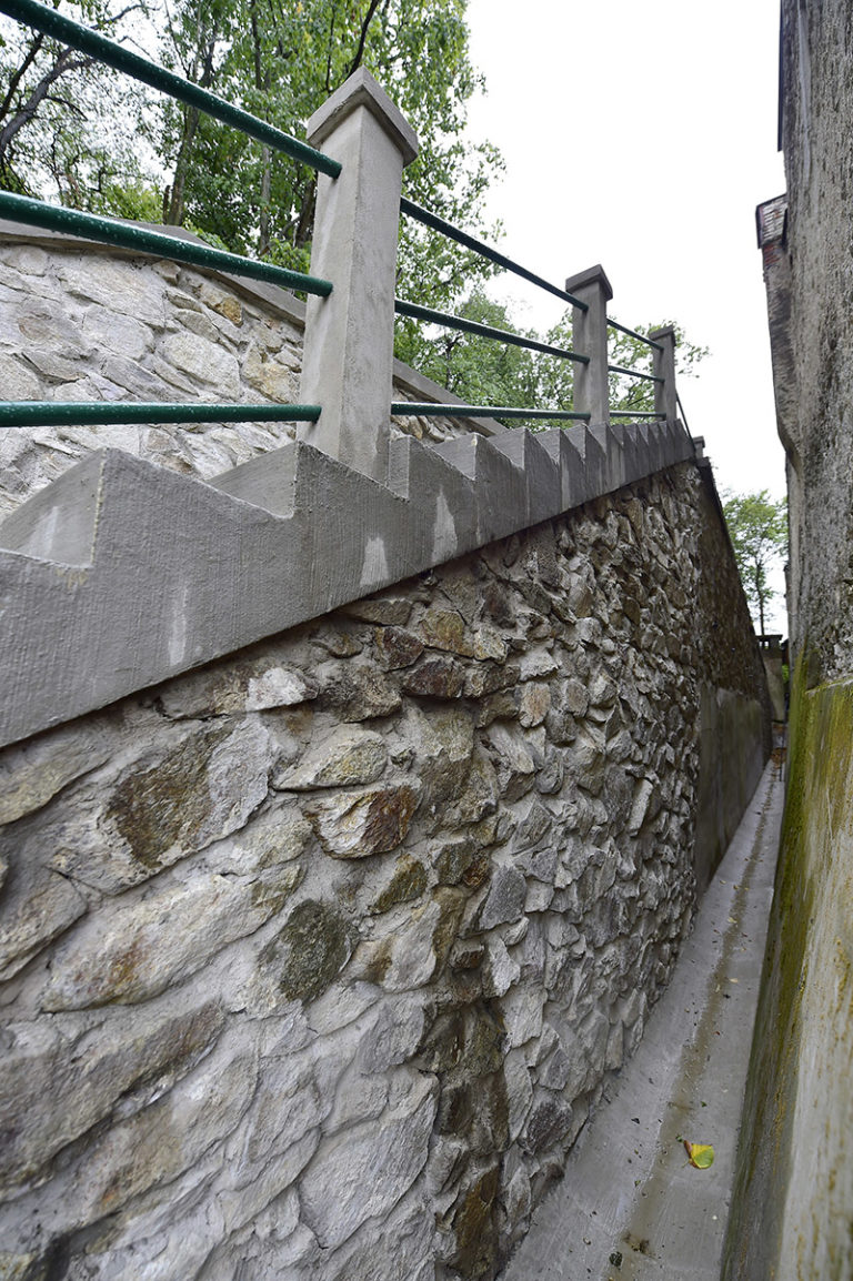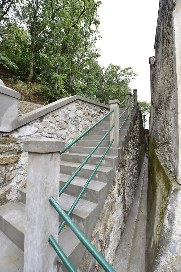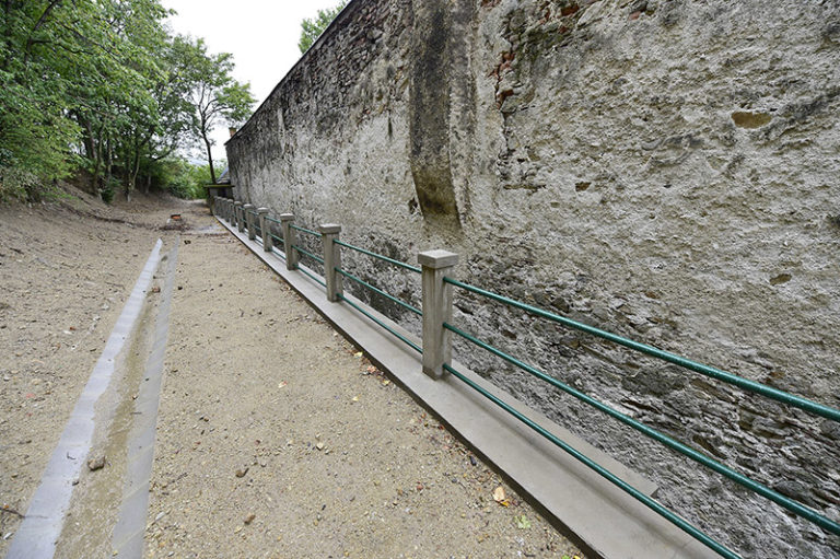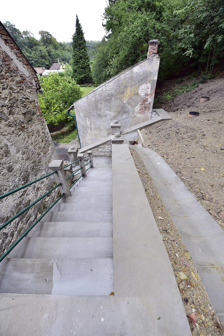 Postupná rekonštrukcia Národnej kultúrnej pamiatky – Kaštieľa v Modre, ktorý je sídlom Malokarpatského osvetového strediska. Prvým krokom bola oprava oporného múru v areáli záhrady kaštieľa, ktorý bol ohrozovaný najmä zosuvom pôdy a koreňovým systémom stromov. Vzhľadom na kultúrnu hodnotu a pamiatkovú zónu, ostal zachovaný pôvodný tvar aj rozmery stáročného schodiska. Bratislava, 28. júl 2017. Foto: SITA/BSK