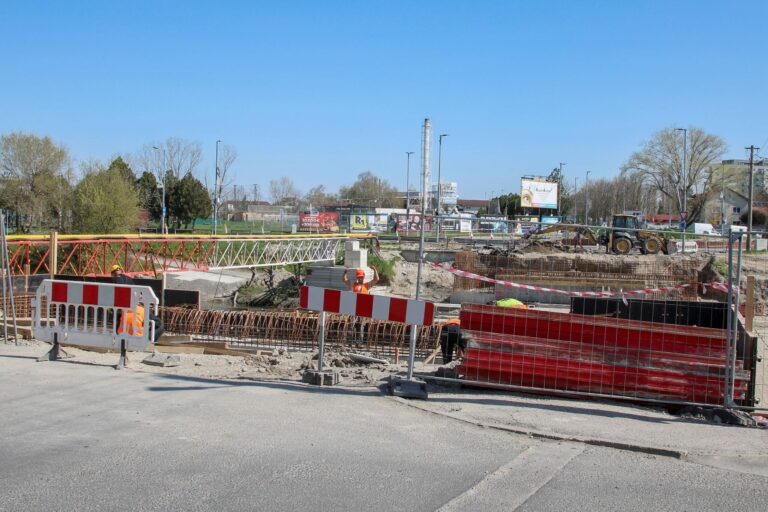 Dočasný most pre mestskú hromadnú dopravu (MHD) a záchranné zložky (uprostred) a pre chodcov (vľavo) pri na stavenisku počas rekonštrukcie mosta na Hradskej ulici cez Malý Dunaj vo Vrakuni. Bratislava, 4. apríl 2025. Foto: SITA