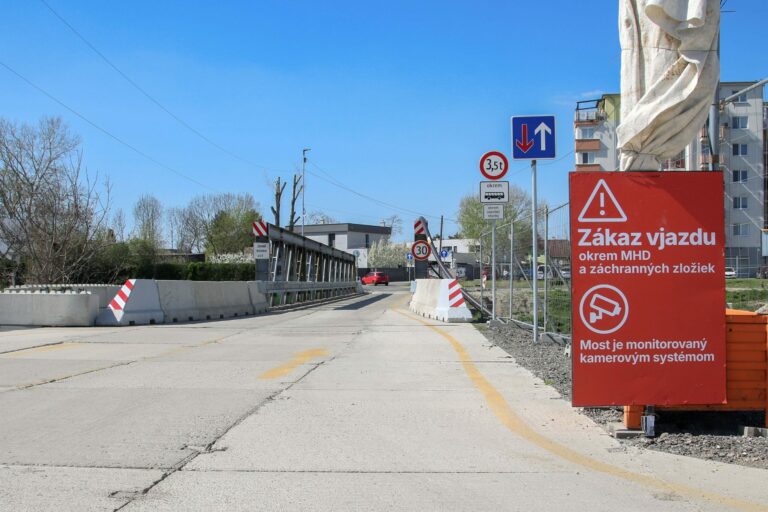 Informačná tabuľa k prestavbe počas rekonštrukcie mosta na Hradskej ulici cez Malý Dunaj vo Vrakuni. Bratislava, 4. apríl 2025. Foto: SITA