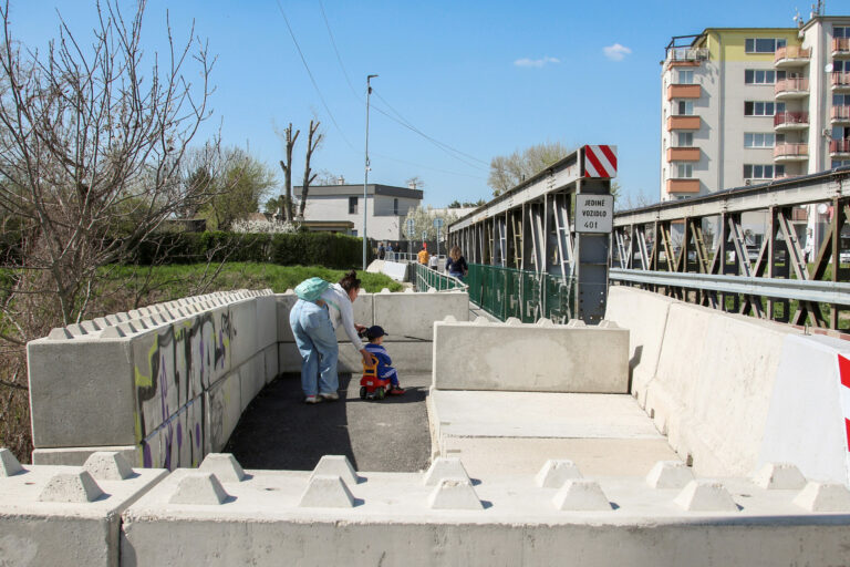 Dočasný most pre mestskú hromadnú dopravu (MHD) a záchranné zložky (vpravo) a pre chodcov (vľavo) pri na stavenisku počas rekonštrukcie mosta na Hradskej ulici cez Malý Dunaj vo Vrakuni. Bratislava, 4. apríl 2025. Foto: SITA