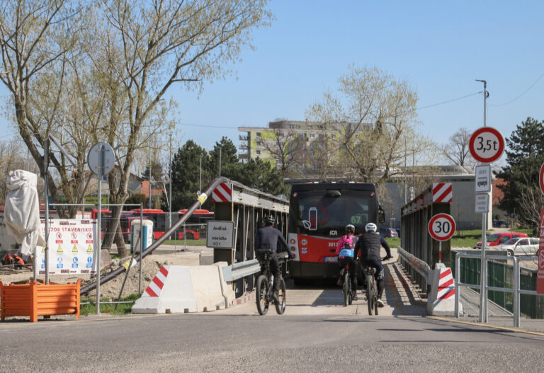 Cyklisti a autobus prechádzajú cez dočasný most ponad Malý Dunaj počas stavebných prác v rámci rekonštrukcie mosta na Hradskej ulici cez Malý Dunaj vo Vrakuni. Bratislava, 4. apríl 2025. Foto: SITA
