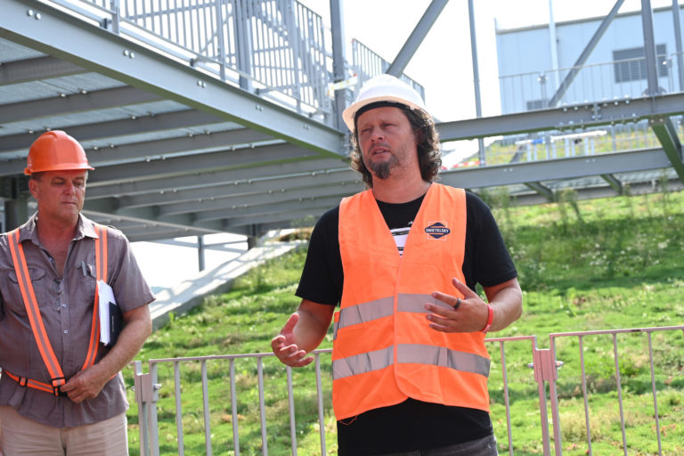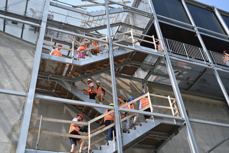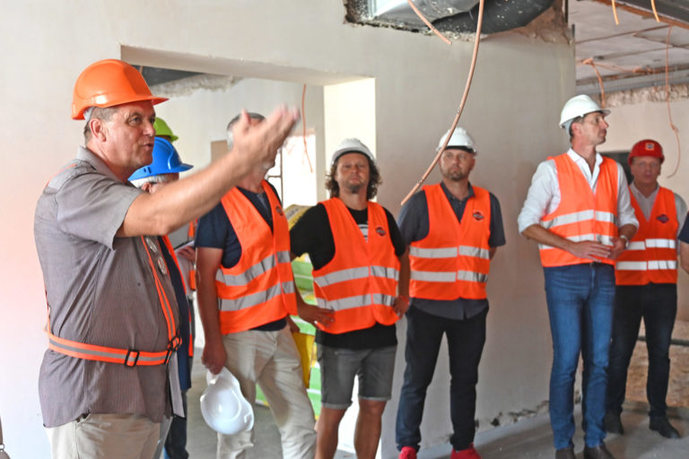Riaditeľ Múzea moderného umenia A. Warhola Martin Cubjak (v popredí), predseda PSK Milan Majerský (vpravo) počas kontrolného dňa k prebiehajúcej investičnej akcii PSK na rekonštrukcii Múzea moderného umenia Andyho Warhola v Medzilaborciach. Medzilaborce, 19. august 2024. Foto: SITA/Viktor Zamborský.