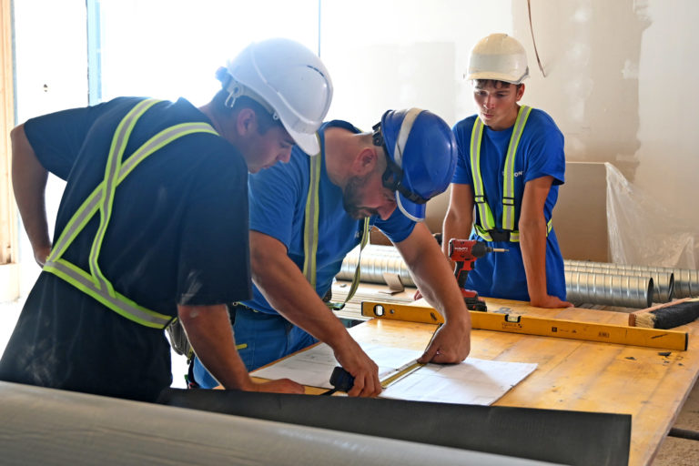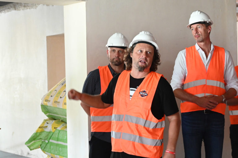 Stavebný dozor Milan Kapec (vľavo) riaditeľ Múzea moderného umenia A. Warhola Martin Cubjak (uprostred), predseda PSK Milan Majerský (druhý sprava) počas kontrolného deňa k prebiehajúcej investičnej akcii PSK na rekonštrukcii Múzea moderného umenia Andyho Warhola v Medzilaborciach. Medzilaborce, 19. august 2024. Foto: SITA/Viktor Zamborský