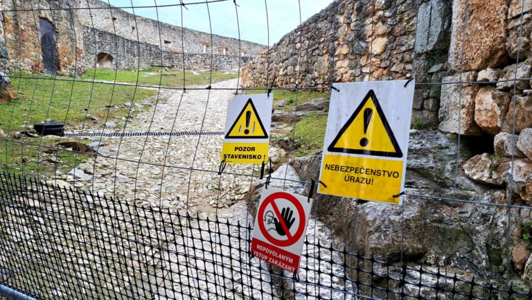 Vstup na stavenisko na Spišskom hrade, ktorý je pre problém s pôvodným dodávateľom už dlhodobo zatvorený. Levoča, 25. október 2023. Foto: SITA/Mária Frisová