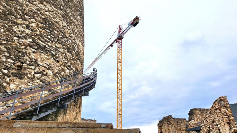 Časť Spišského hradu (v pozadí) s problematickým žeriavom počas druhej etapy rekonštrukcie Románskeho paláca a západných palácov. Levoča, 25. október 2023. Foto: SITA/Mária Frisová.