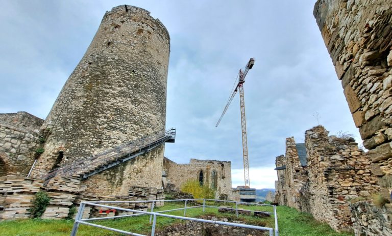 Horné nádvorie Spišského hradu s problematickým žeriavom (v pozadí) počas druhej etapy rekonštrukcie Románskeho paláca a západných palácov. Levoča, 25. október 2023. Foto: SITA/Mária Frisová.