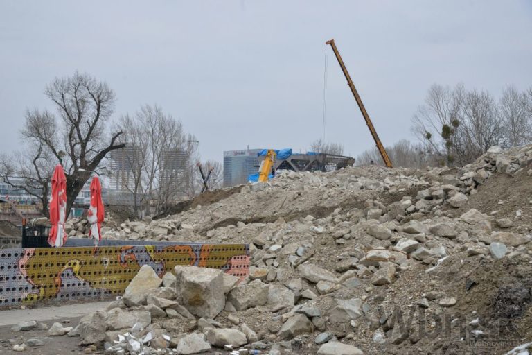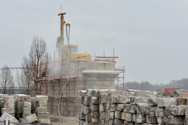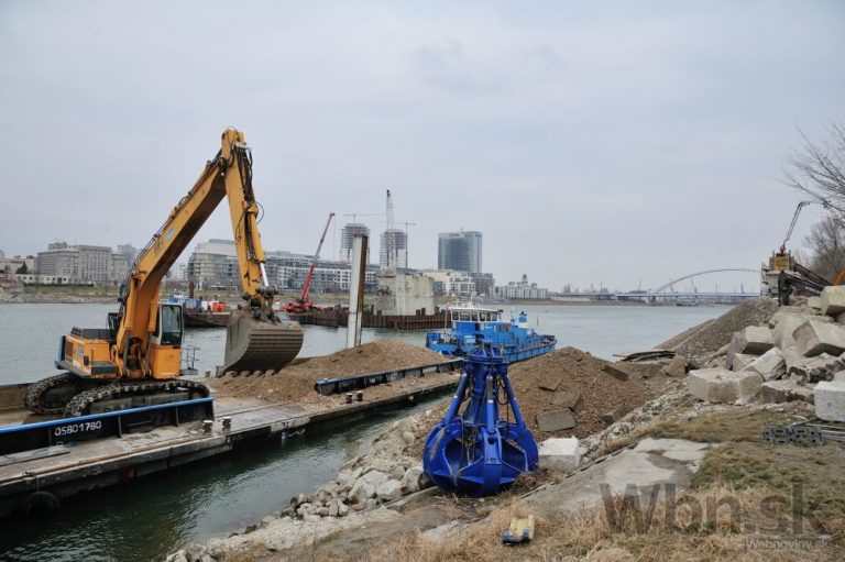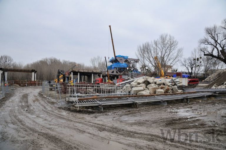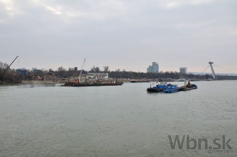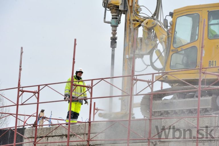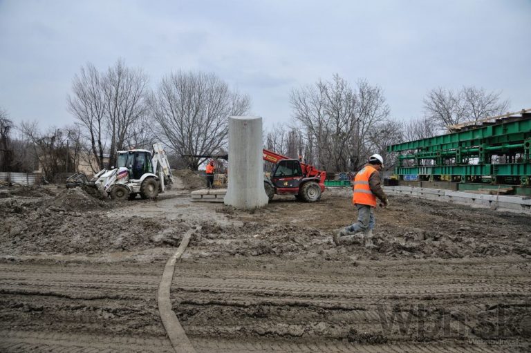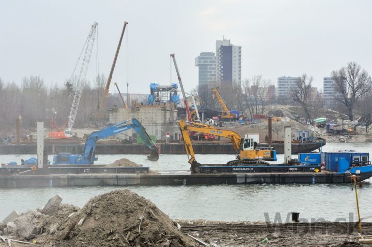 Práce na prestavbe Starého mosta a budovaní prvej časti električkovej trate do Petržalky. Nový pilier nahradí zbúraný tretí a štvrtý pilier. Zároveň robotníci pokračujú na zosilňovaní piateho piliera, ktorý je dôležitý pre následné vysúvanie mostovej konštrukcie. Bratislava, 17. február 2015. Foto: SITA/Robert Tappert