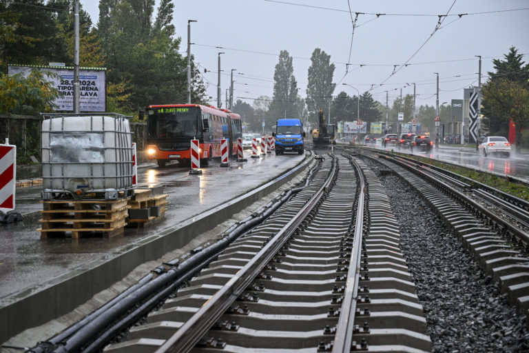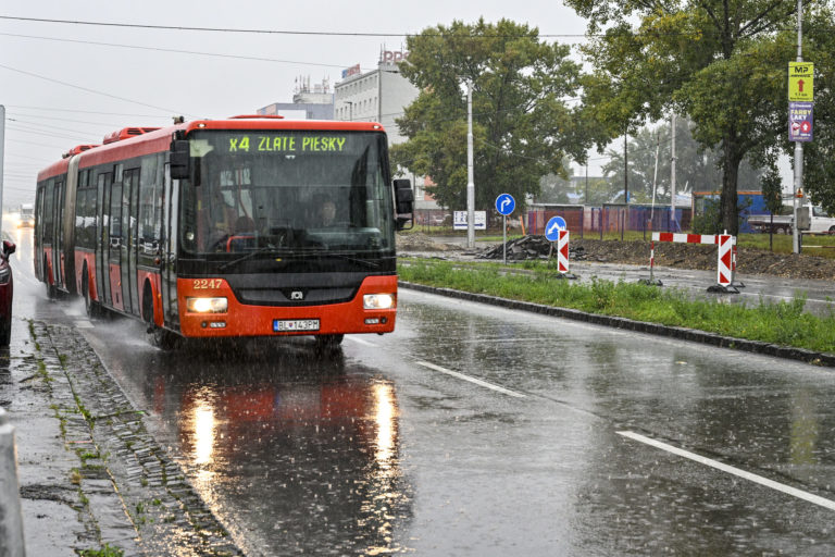 Pohľad na zastávku a náhradnú autobusovú linku X4 (vľavo) počas rekonštrukcie Vajnorskej radiály na ceste v úseku, ktorý spája Trnavské mýto so Zlatými pieskami v Bratislave. Bratislava, 27. október 2023. Foto: SITA/Milan Illík