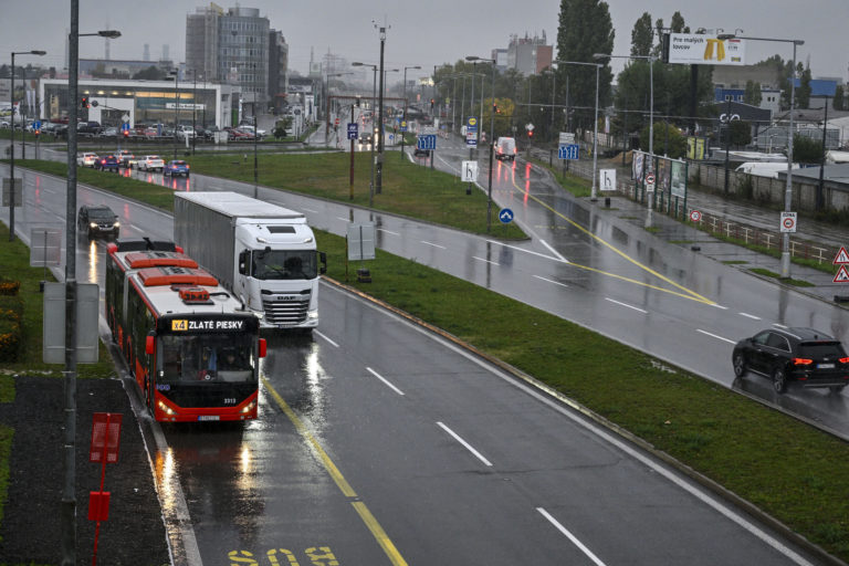 Pohľad na zastávku Vajnorská, náhradnú autobusovú linku X4 počas rekonštrukcie Vajnorskej radiály na ceste v úseku, ktorý spája Trnavské mýto so Zlatými pieskami v Bratislave. Bratislava, 27. október 2023. Foto: SITA/Milan Illík