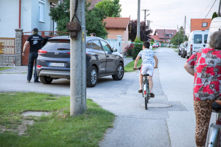 Uzatvorená ulica a okolie domu počas rekonštrukcie vraždy v rodinnom dome investigatívneho novinára Jána Kuciaka a jeho snúbenice Martiny Kušnírovej v obci Veľká Mača, v ktorom na konci februára našla polícia ich mŕtve telá. Veľká Mača, 29. máj 2018. Foto: archívne, SITA/Diana Černáková