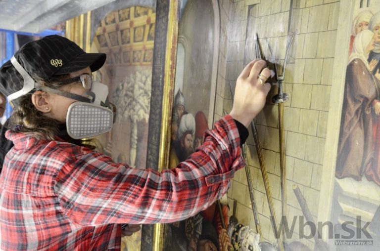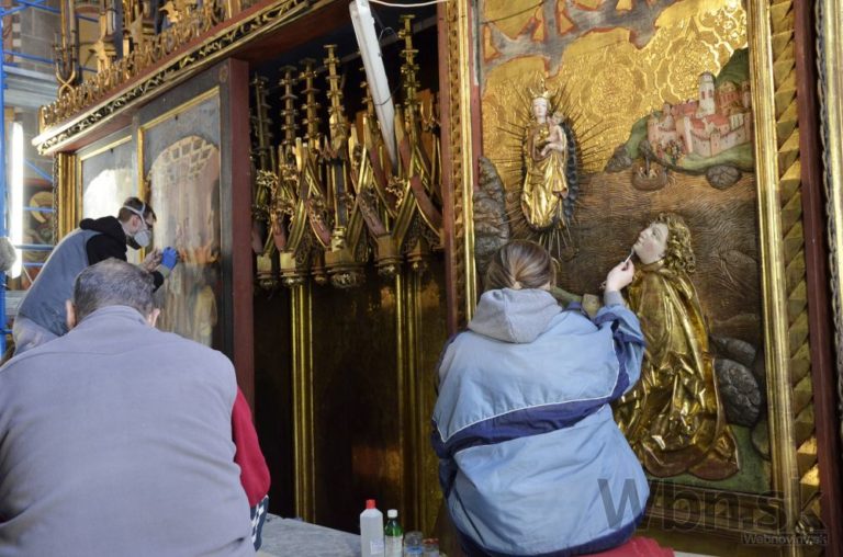 Reštaurátorske práce na najvyššom gotickom oltári počas tlačovej besedy Oblastného reštaurátorského ateliéru v Levoči k reštaurovaniu najvyššieho gotického oltára na svete v Chráme sv. Jakuba. Levoča, 22. máj 2014. Foto: SITA/Radoslav Maťaš