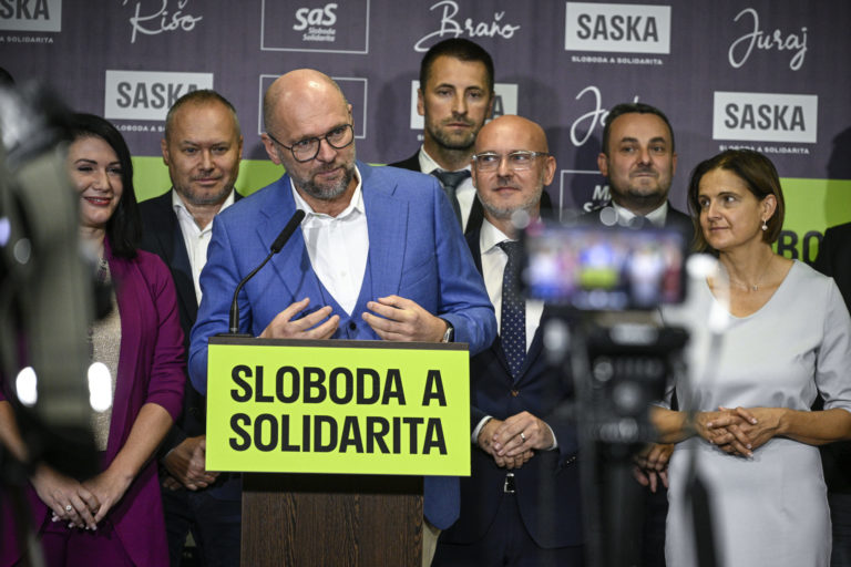 Zľava v popredí: Členka republikovej rady Jana Bittó Cigániková a predseda politickej strany Sloboda a Solidarita (SaS) Richard Sulík počas tlačovej konferencie strany Sloboda a Solidarita (SaS), na ktorej oznámil predseda SaS, že na kongrese strany, ktorý sa bude konať v marci 2024, nebude kandidovať na post predsedu. Bratislava, 23. október 2023. Foto: SITA/Milan Illík.