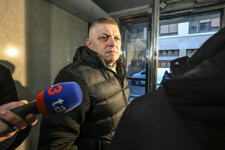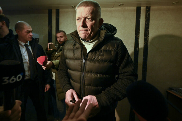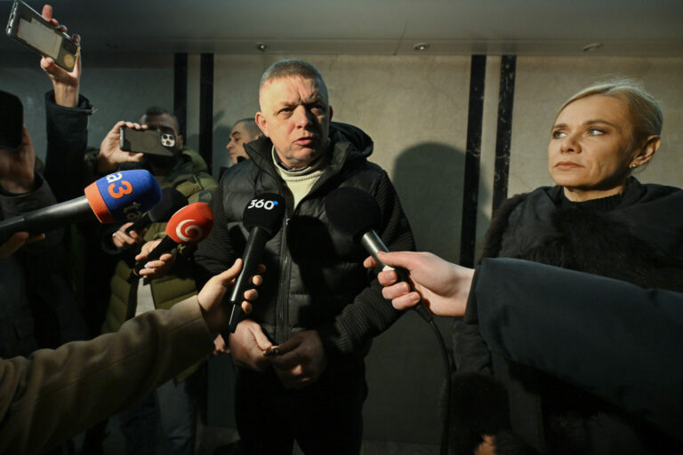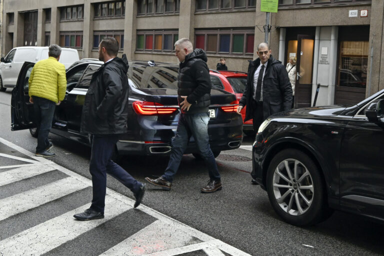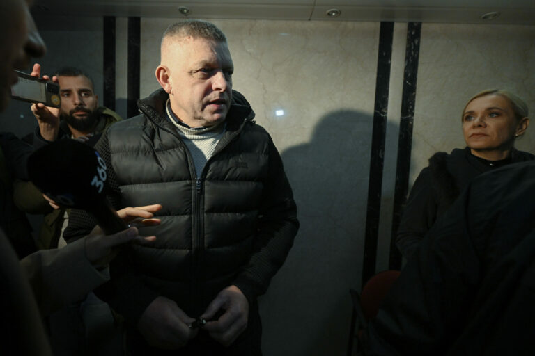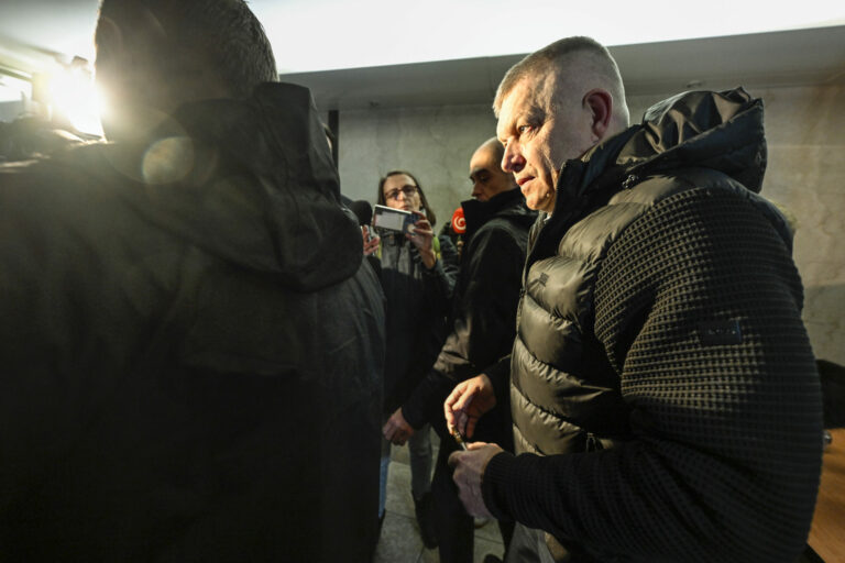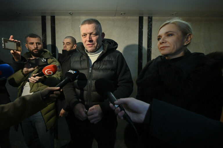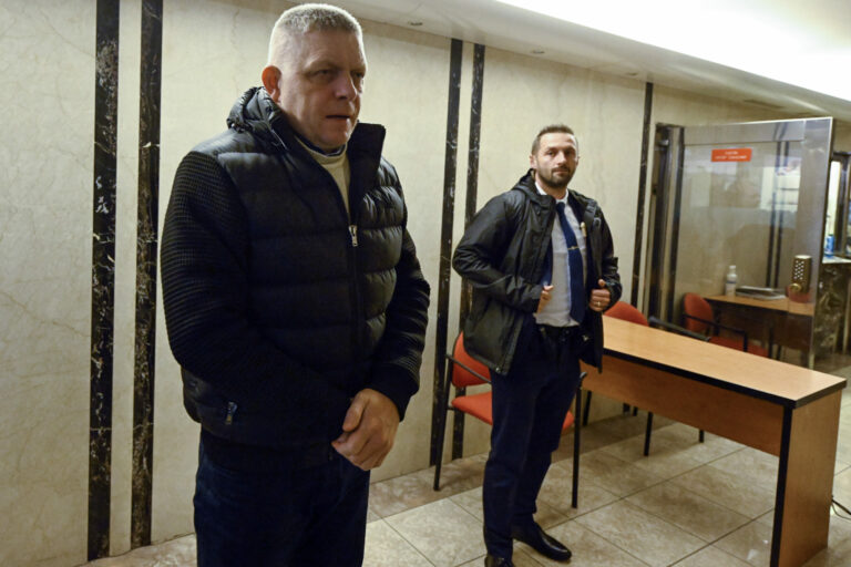 Predseda vlády SR Robert Fico (vľavo) počas podania trestného oznámenia na Generálnu prokuratúru (GP) SR, ktoré súvisí so zisteniami Najvyššieho kontrolného úradu (NKÚ) SR pri výstavbe závodu Volvo v Priemyselnom parku Valaliky. Bratislava, 28. november 2024. Foto: SITA/Milan Illík