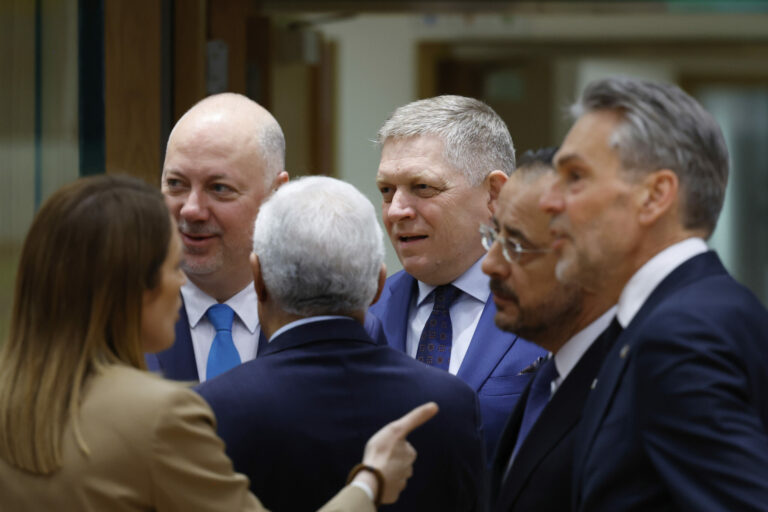 Zľava predsedníčka Európskeho parlamentu Roberta Metsola, bulharský premiér Rossen Jeliazkov, predseda Európskej rady Antonio Costa, slovenský premiér Robert Fico, cyperský prezident Nikos Christodoulides a holandský premiér Dick Schoof sa zúčastňujú stretnutia za okrúhlym stolom na samite EÚ v Bruseli, štvrtok 20. marca 2025. Foto: SITA/AP