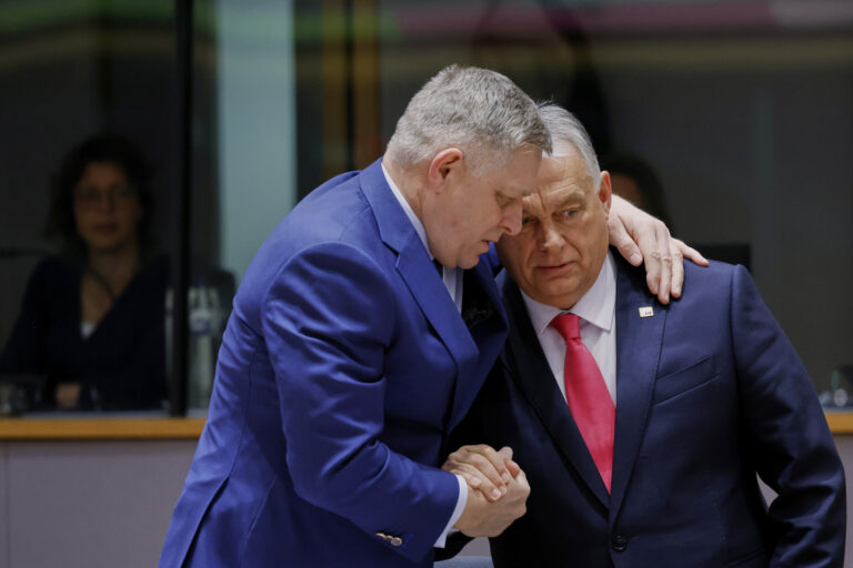 Slovenský premiér Robert Fico (vľavo) s maďarským premiérom Viktorom Orbánom počas stretnutia za okrúhlym stolom na samite EÚ v Bruseli vo štvrtok 20. marca 2025. Foto: SITA/AP