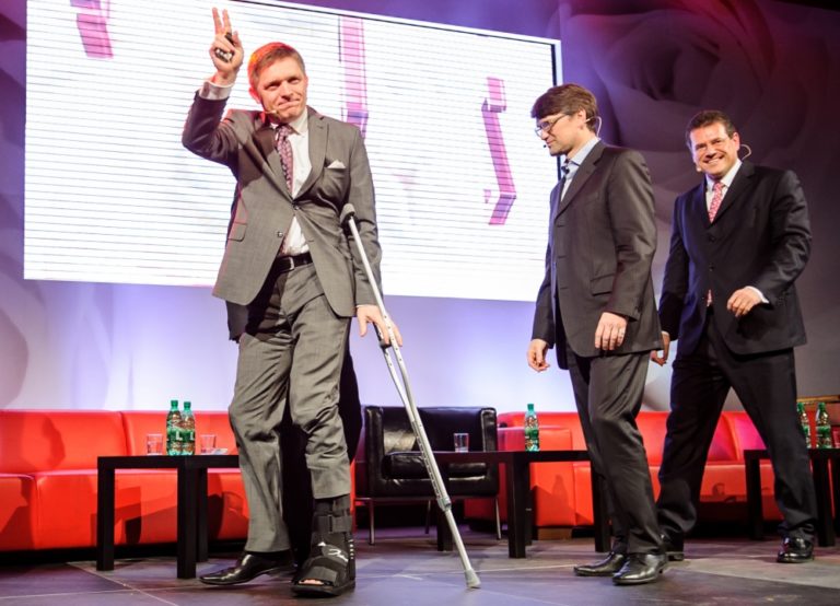 Zľava: Predseda strany Smer-SD Robert Fico, podpredseda strany Smer-SD Marek Maďarič a líder kandidátky do EP za stranu Smer-SD Maroš Šefčovič počas odchodu z podujatia pri príležitosti osláv Medzinárodného dňa žien v Nitre. Nitra, 5. marec 2014. Foto: SITA/Martin Havran