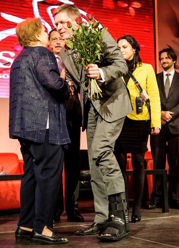 Pohľad na zranenie predsedu strany Smer-SD Roberta Fica počas podujatia pri príležitosti osláv MDŽ v Nitre za účasti predstaviteľov strany Smer-SD. Nitra, 5. marec 2014. Foto: SITA/Martin Havran
