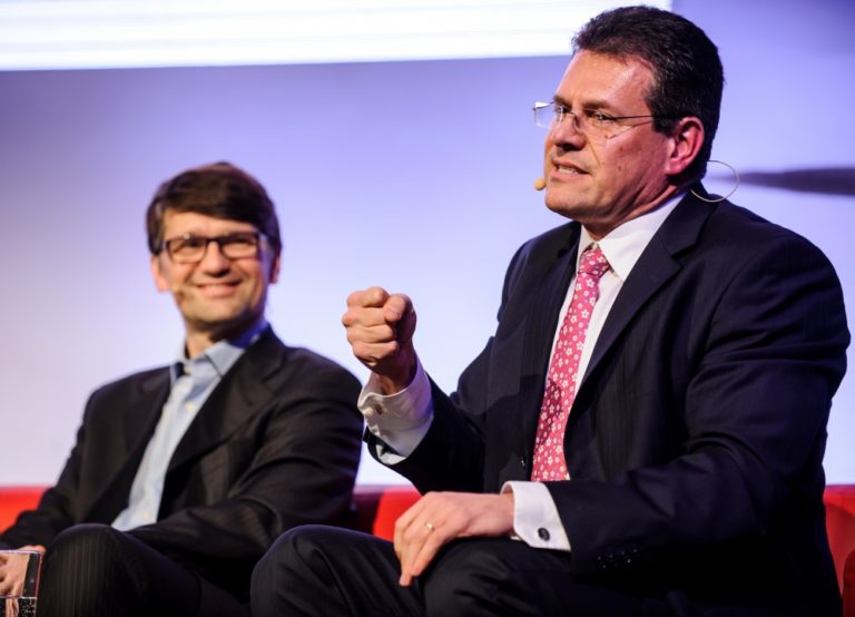 Zľava: Podpredseda Smeru Marek Maďarič a líder kandidátky Smeru do Európskeho parlamentu Maroš Šefčovič počas podujatia pri príležitosti osláv MDŽ v Nitre za účasti predstaviteľov Smeru. Nitra, 5. marec 2014. Foto: SITA/Martin Havran