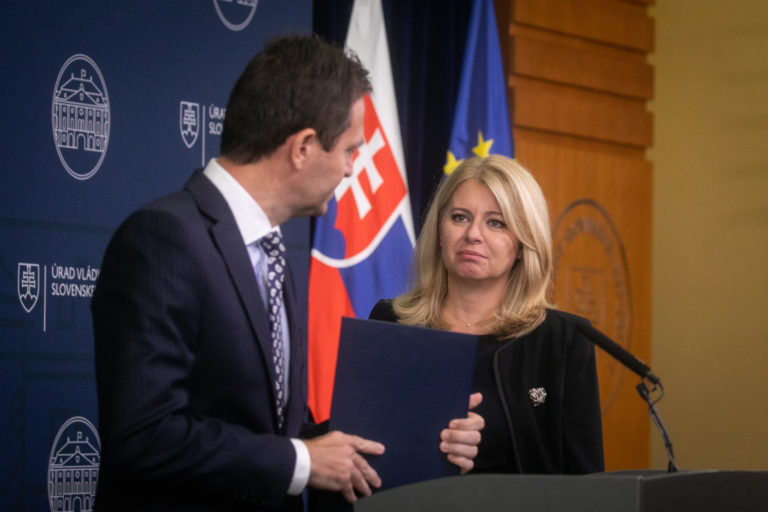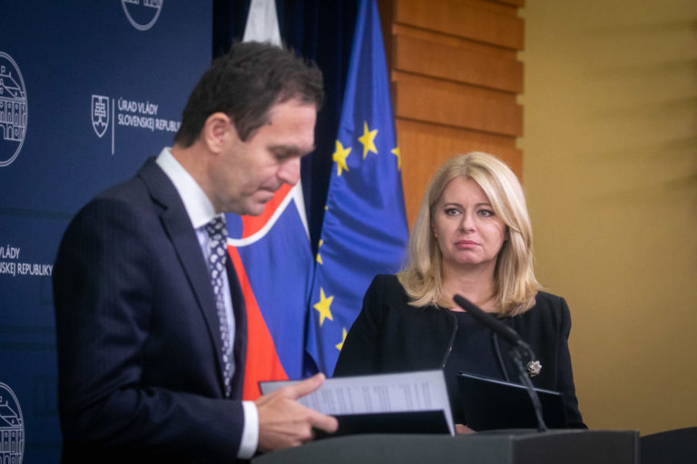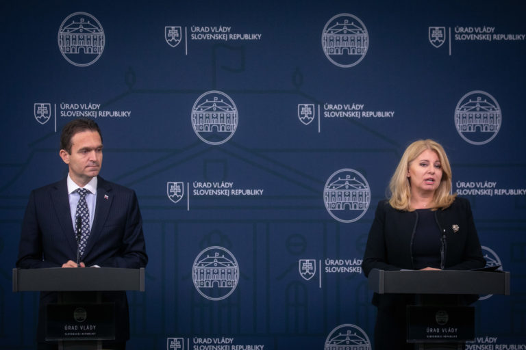 Sprava: Prezidentka SR Zuzana Čaputová a dočasne poverený predseda vlády SR a minister vnútra SR Ľudovít Ódor počas tlačovej konferencie po rokovaní Bezpečnostnej rady SR na Úrade vlády v súvislosti so zadržaním 5 ľudí pod názvom Rozuzlenie Národnou kriminálnou agentúrou (NAKA). Bratislava, 18. august 2023. Foto: SITA/Diana Černak