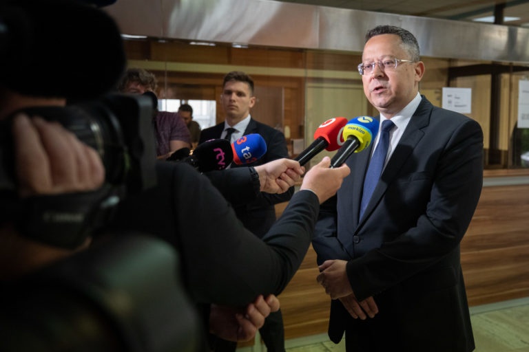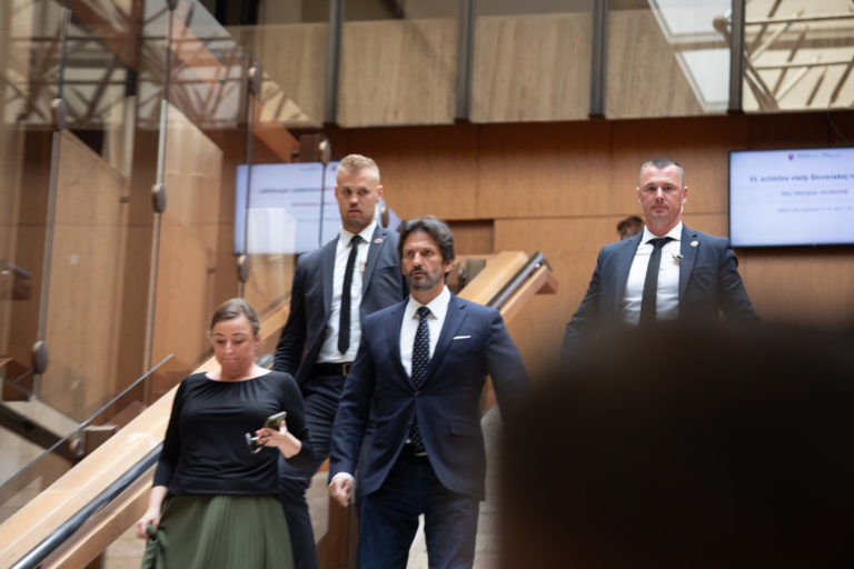 Minister vnútra SR Matúš Šutaj Eštok (v popredí) počas brífingu po skončení mimoriadneho rokovania Bezpečnostnej rady SR a rokovania vlády SR na Úrade vlády SR kvôli streľbe na premiéra SR Roberta Fica v Handlovej. Bratislava, 16. máj 2024. Foto: SITA/Diana Černák
