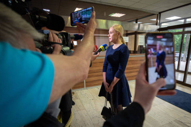 Podpredsedníčka vlády a ministerka hospodárstva SR Denisa Saková (vpravo) odpovedá na otázky novinárov počas príchodu pre začatím mimoriadneho rokovania Bezpečnostnej rady SR a rokovania vlády SR na Úrade vlády SR po streľbe na premiéra SR Roberta Fica v Handlovej. Bratislava, 16. máj 2024. Foto: SITA/Diana Černák