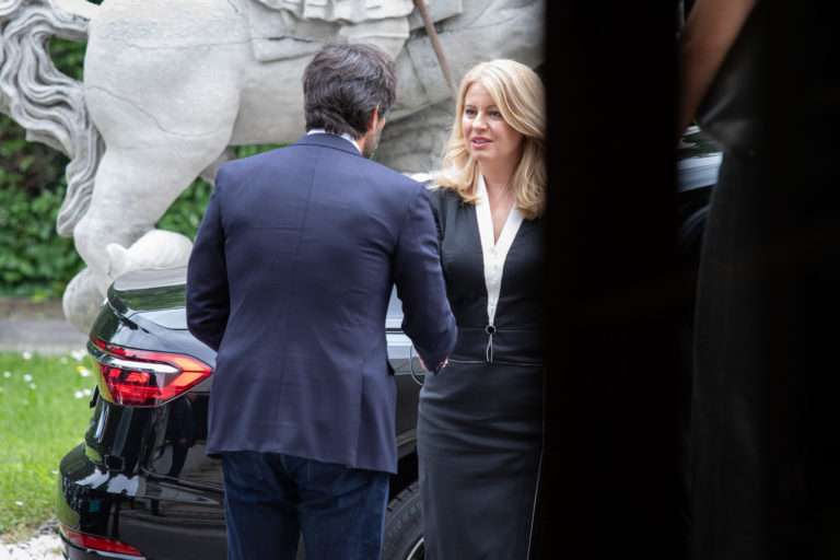 Sprava: Prezidentka SR Zuzana Čaputová a minister obrany SR Robert Kaliňák počas príchodu na mimoriadne rokovanie Bezpečnostnej rady SR a rokovanie vlády SR na Úrade vlády SR po streľbe na premiéra SR Roberta Fica v Handlovej. Bratislava, 16. máj 2024. Foto: SITA/Diana Černák