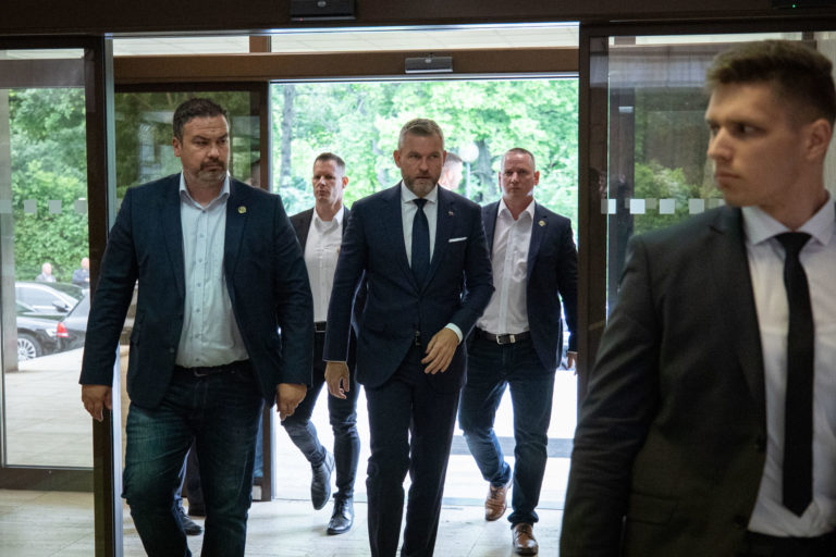 Novozvolený prezident SR Peter Pellegrini (uprostred) počas príchodu na mimoriadne rokovanie Bezpečnostnej rady SR a rokovanie vlády SR na Úrade vlády SR po streľbe na premiéra SR Roberta Fica v Handlovej. Bratislava, 16. máj 2024. Foto: SITA/Diana Černák