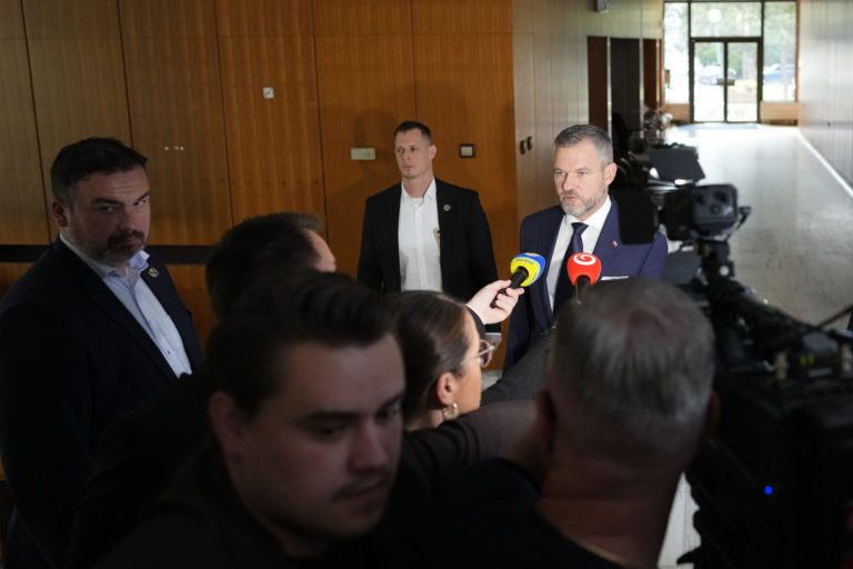 Novozvolený prezident SR Peter Pellegrini prehovoril pre médiá po tlačovom vyhlásení v prezidentskom paláci v Bratislave vo štvrtok 16. mája 2024. Foto: SITA/AP