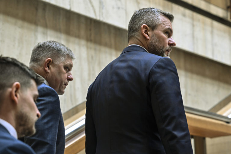Predseda NR SR Peter Pellegrini (druhý zľava) a predseda vlády SR Robert Fico (vpravo) počas príchodu na rokovanie 19. schôdze vlády SR. Bratislava, 26. február 2024. Foto: SITA/Milan Illík