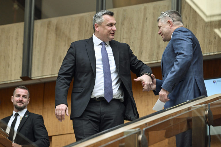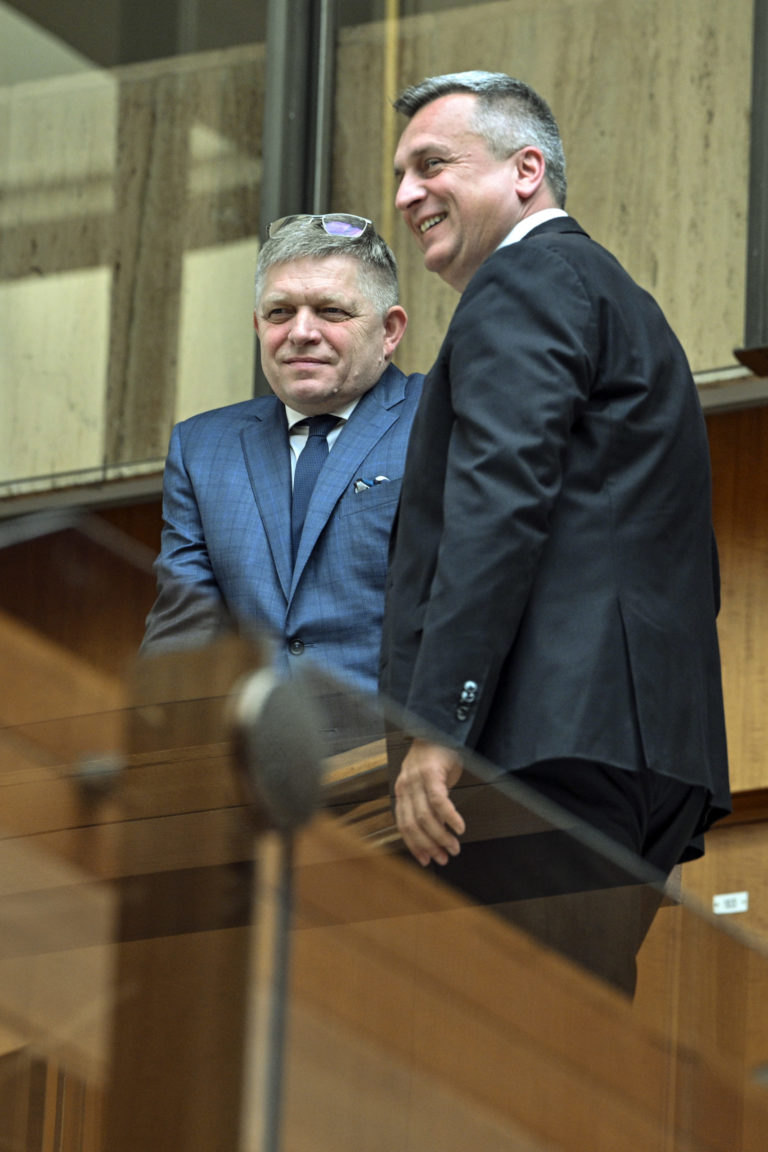 Zľava: Predseda vlády SR Robert Fico a podpredseda NR SR Andrej Danko po ukončení rokovania 19. schôdze vlády SR a Bezpečnostnej rady SR. Bratislava, 26. február 2024. Foto: archívne, SITA/Milan Illík