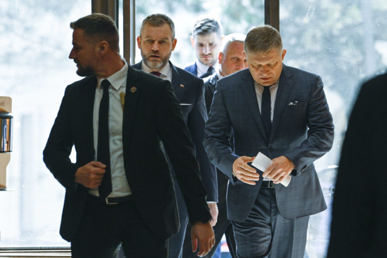 Sprava: Predseda NR SR Peter Pellegrini a premiér SR Robert Fico počas príchodu na rokovanie 19. schôdze vlády SR a Bezpečnostnej rady SR. Bratislava, 26. február 2024. Foto: SITA/Milan Illík