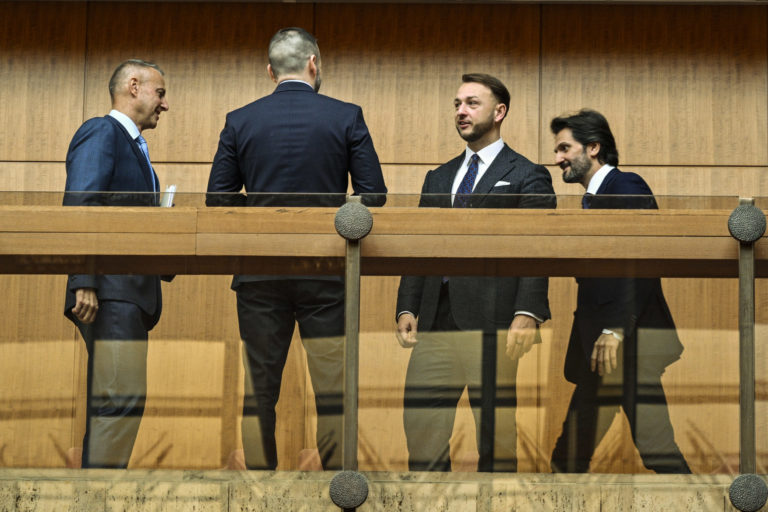 Predseda NR SR Peter Pellegrini (druhý zľava) a predseda vlády SR Robert Fico (druhý sprava) počas príchodu na rokovanie 19. schôdze vlády SR. Bratislava, 26. február 2024. Foto: archívne, SITA/Milan Illík