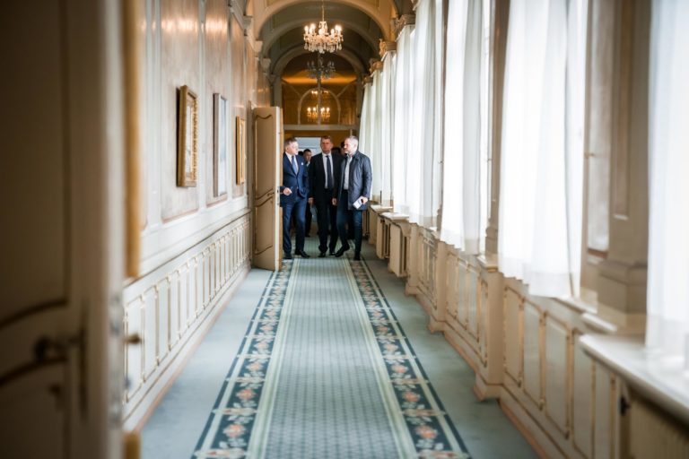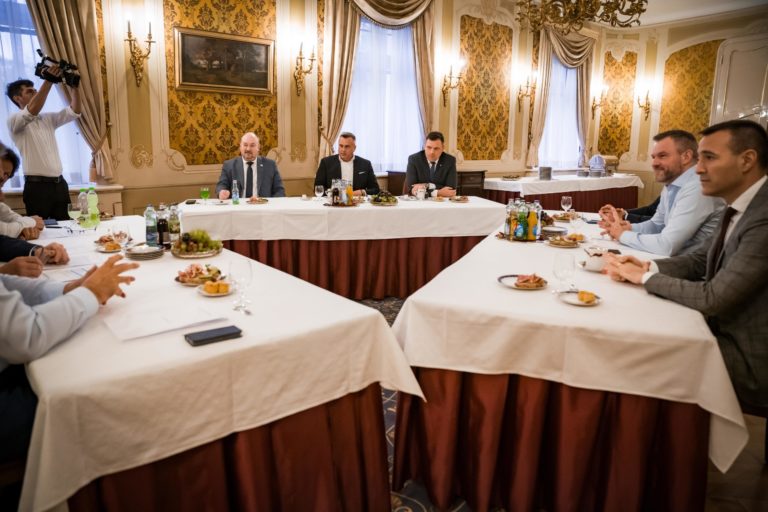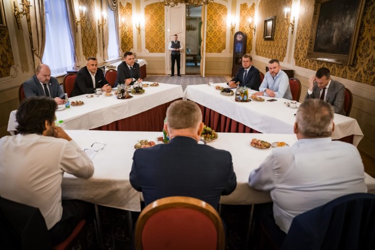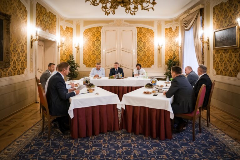 Rokovanie koaličnej rady na úrovni trojčlenných delegácii vedených predsedami koaličných strán SMER – SSD, HLAS - SD a SNS na Úrade vlády SR o koordinácii postupu koaličných strán v rámci schôdze NR SR, ktorá začne 16. apríla 2024. Bratislava, 10. apríl 2024. Foto: SITA/Úrad vlády SR.