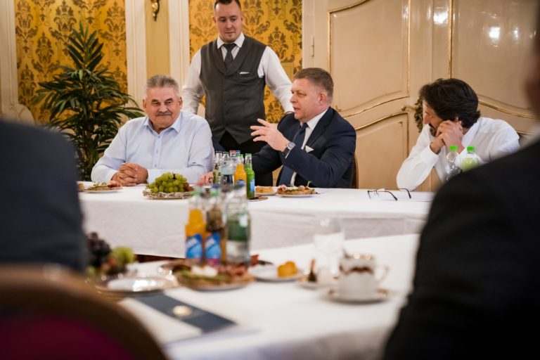 Zľava v popredí: Podpredseda vlády SR Robert Fico, člen predsedníctva Hlas-SD Peter Žiga a predseda strany Hlas-SD Peter Pellegrini pred začatím rokovania koaličnej rady na Úrade vlády SR o koordinácii postupu koaličných strán v rámci schôdze NR SR, ktorá začne 16. apríla 2024. Bratislava, 10. apríl 2024. Foto: SITA/Úrad vlády SR.