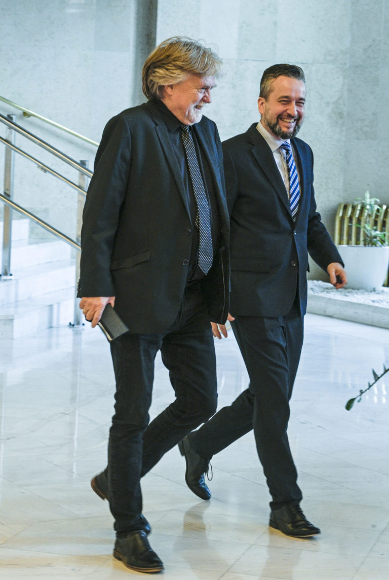 Minister školstva, vedy, výskumu a športu SR Tomáš Drucker (vľavo) po schválení programového vyhlásenia vlády (PVV) Roberta Fica v rámci rokovania 3. schôdze Národnej rady SR. Bratislava, 21. november 2023. Foto: SITA/ Milan Illík