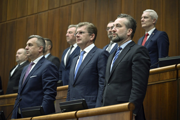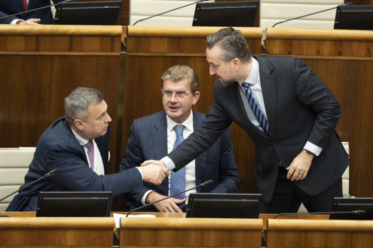 Zľava: Podpredseda NR SR Andrej Danko, podpredseda NR SR NR SR Peter Žiga a podpredseda NR SR Ľuboš Blaha pred začatím rokovania 2. schôdze Národnej rady SR a návrhu skupiny poslancov Národnej rady SR na odvolanie Ľuboša Blahu z funkcie podpredsedu parlamentu. Bratislava, 14. november 2023. Foto: SITA/Milan Illík