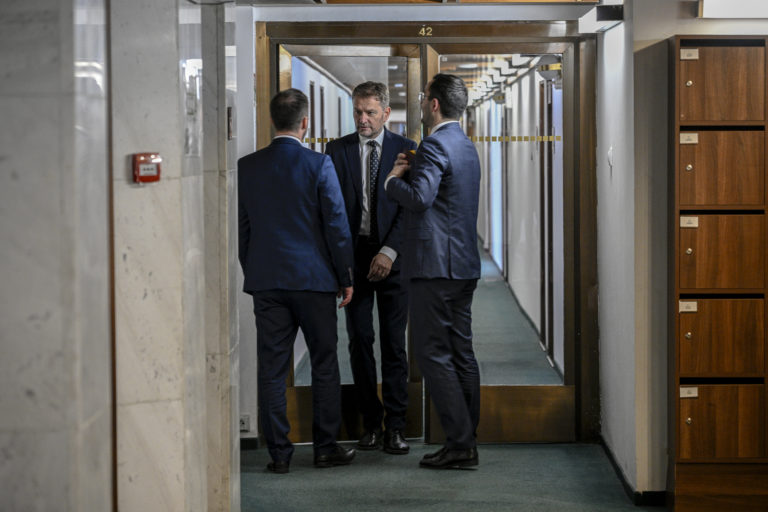 Zľava v popredí: Podpredseda NR SR Michal Šimečka a predseda NR SR Peter Pellegrini. Foto: SITA/Milan Illík